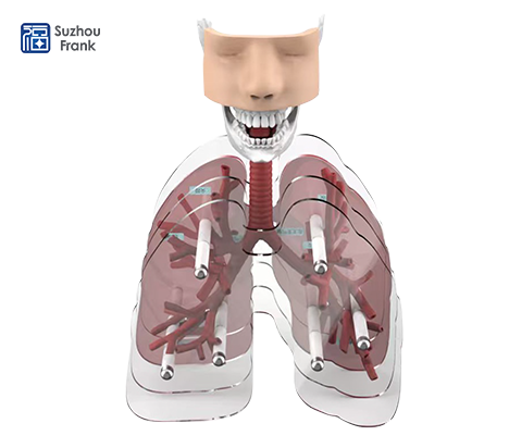 Based on human bronchial tree 3D modeling (reaching grade 4 bronchial branches), this model fully exposes bilateral bronchi. It supports visual/closed training for different difficulty levels, compatible with any commercial fiberoptic bronchoscope for operations like exploration, sputum suction, and foreign body picking. Head parts A (mouth/nose entry) and B (direct main bronchus entry) offer differentiated training, with reusability, low cost, and high portability.