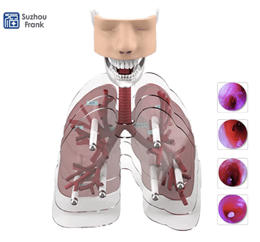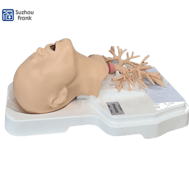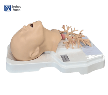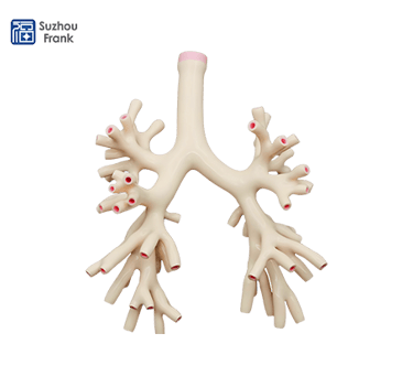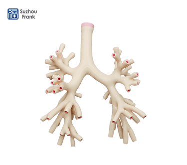 The bronchial intervention training model simulates the branching structure of the human bronchial tree based on 3D modeling of human anatomical data. It can be reversed to a four-level bronchial branch configuration and is compatible with any commercially available real fiberoptic bronchoscope for procedural exploration training, sputum suction, foreign body removal, and other operations. Head A can be inserted into the bronchi via the mouth or nose, while head B can be directly inserted into the main bronchus. The model is reusable and cost-effective.