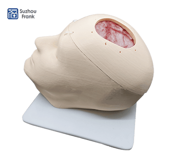 The Dural Repair Training Model is a 3D-reconstructed head model based on real human data, simulating dural membrane and brain parenchyma structure, designed to train neurosurgical extramural techniques like dural cutting, suturing, and patch application.