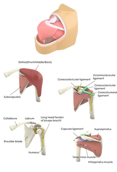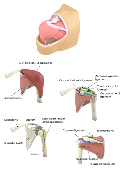 The shoulder muscle renderings illustrate muscles like deltoid (front, middle, back), subscapularis, and ligaments such as acromioclavicular ligament, coracoclavicular ligament, etc., offering a detailed view of shoulder muscle and ligament anatomy.Overall Training Model Functionality